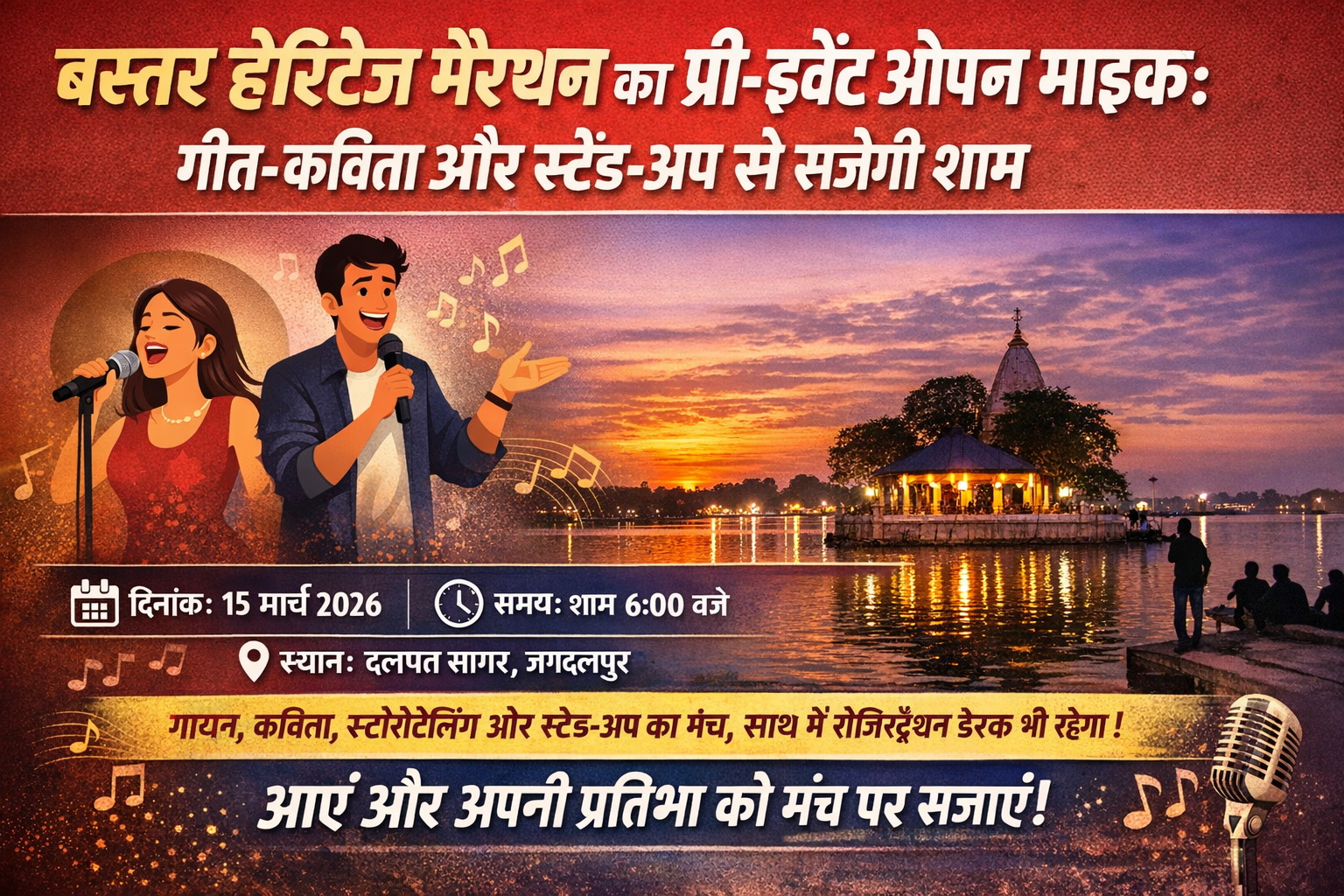 जगदलपुर -बस्तर हैरिजेट मैराथन के प्री-इवेंट के रूप में एक खास ओपन माइक सेशन का आयोजन किया जा रहा है, जिसमें शहर के कलाकारों और युवाओं को अपनी प्रतिभा दिखाने का अवसर मिलेगा। यह कार्यक्रम 15 मार्च 2026 को शाम 6 बजे से दलपत सागर द्वीप, जगदलपुर में आयोजित होगा।